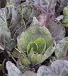 Die Blätter des Rosenkohls sind blau-grün, weiß geädert, rundlich, gewellt.