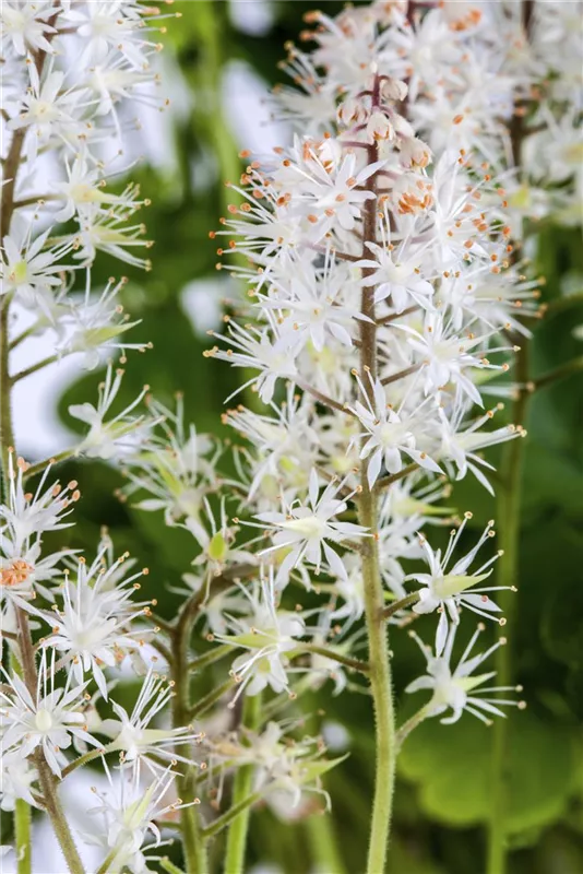 Tiarella cordifolia bildet in Doldentrauben angeordnete, weiße Blüten ab Mai. Diese verströmen einen angenehmen Duft.