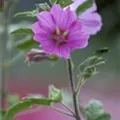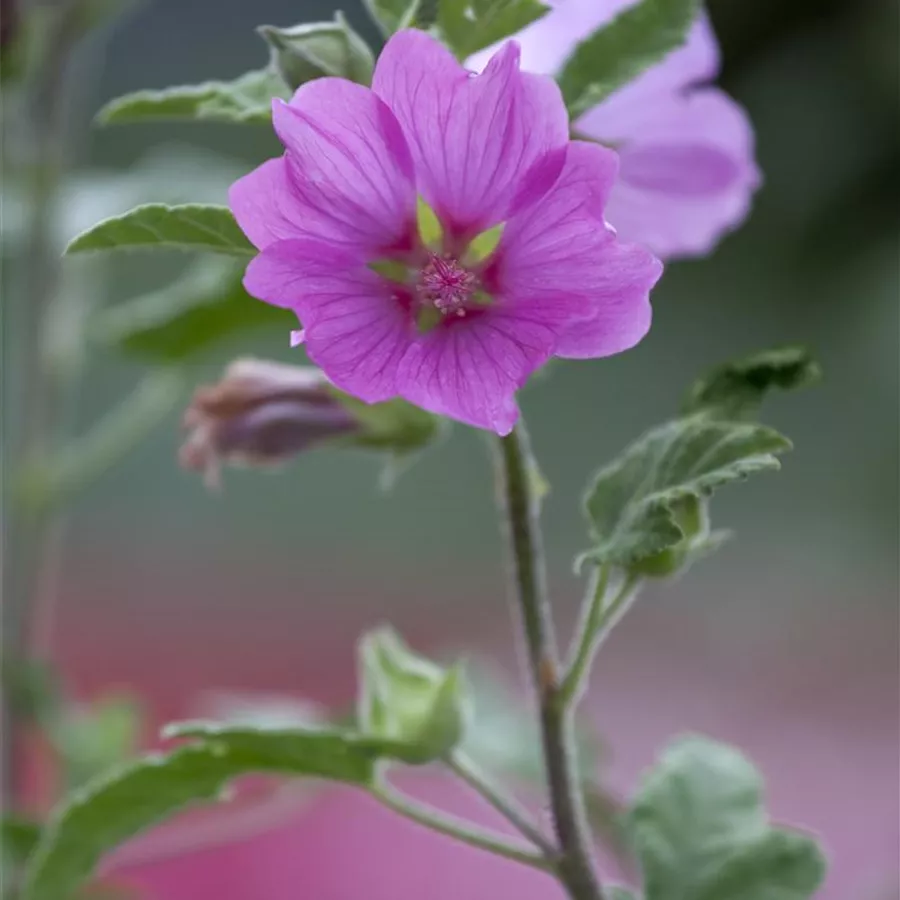 Lavatera x olbia bildet schalenförmige, rosafarbene, weiße, lilafarbene Blüten ab Juni. Diese werden etwa 5 - 10 cm groß.