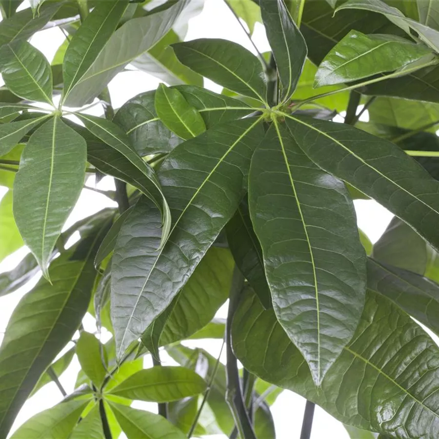 Die sommergrünen Blätter der Glückskastanie sind dunkelgrün, glänzend, handförmig.