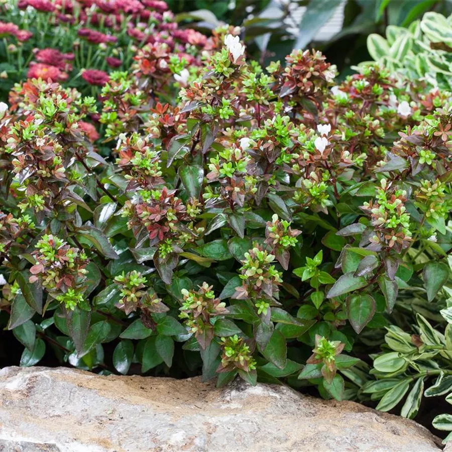 Großblütige Abelie ist ein buschig und dicht wachsender Strauch. Sie erreicht gewöhnlich eine Höhe von 1,5 - 2 m und wird ca. 1 - 1,5 m breit. In der Regel wächst sie 15 - 30 cm pro Jahr.