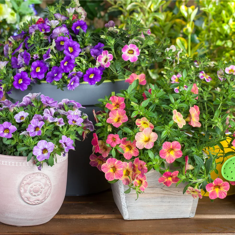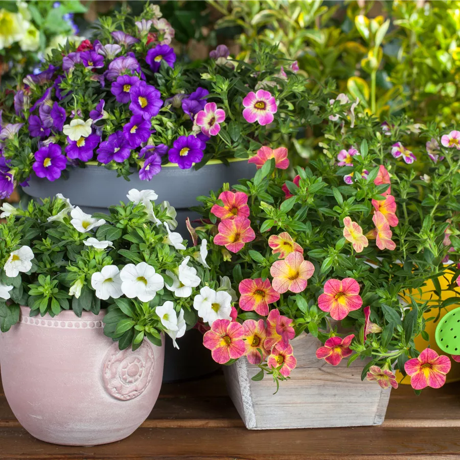 Calibrachoa 'Celebration'® bildet während der gesamten Saison zahlreiche trichterförmige, gelbe, orangefarbene, rote, rosafarbene, violette, weiße Blüten.