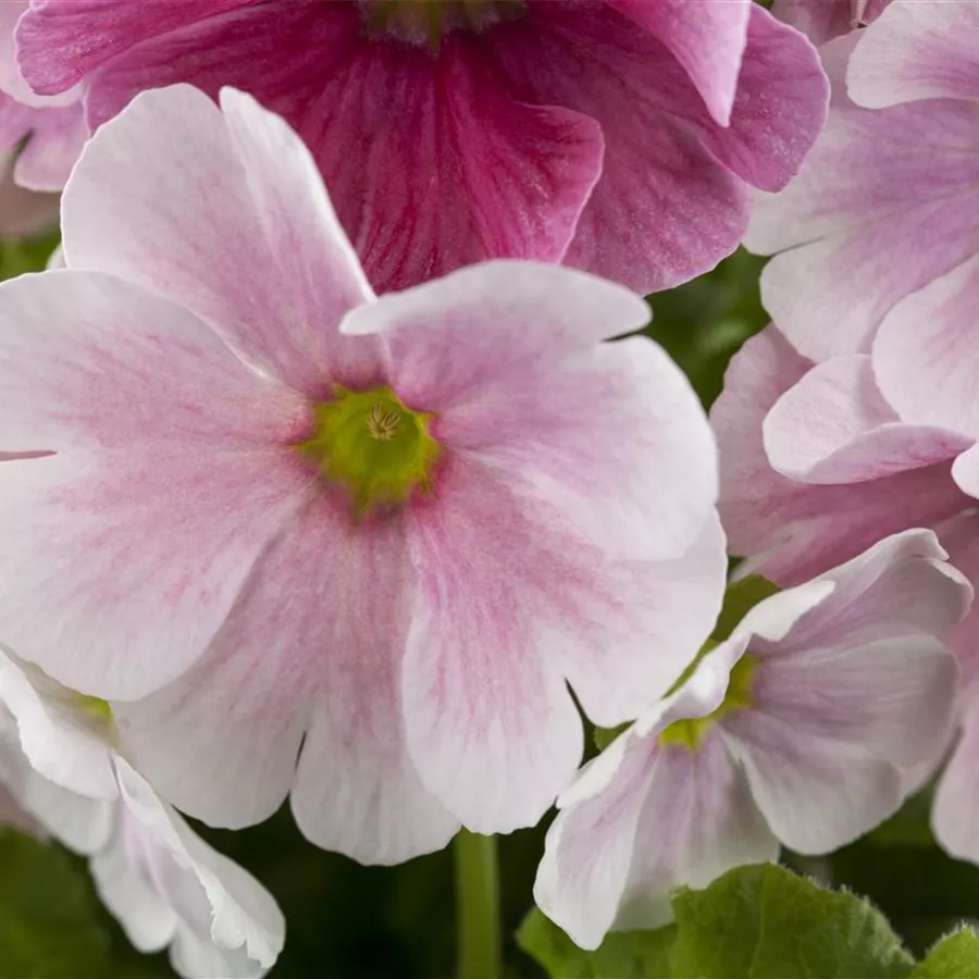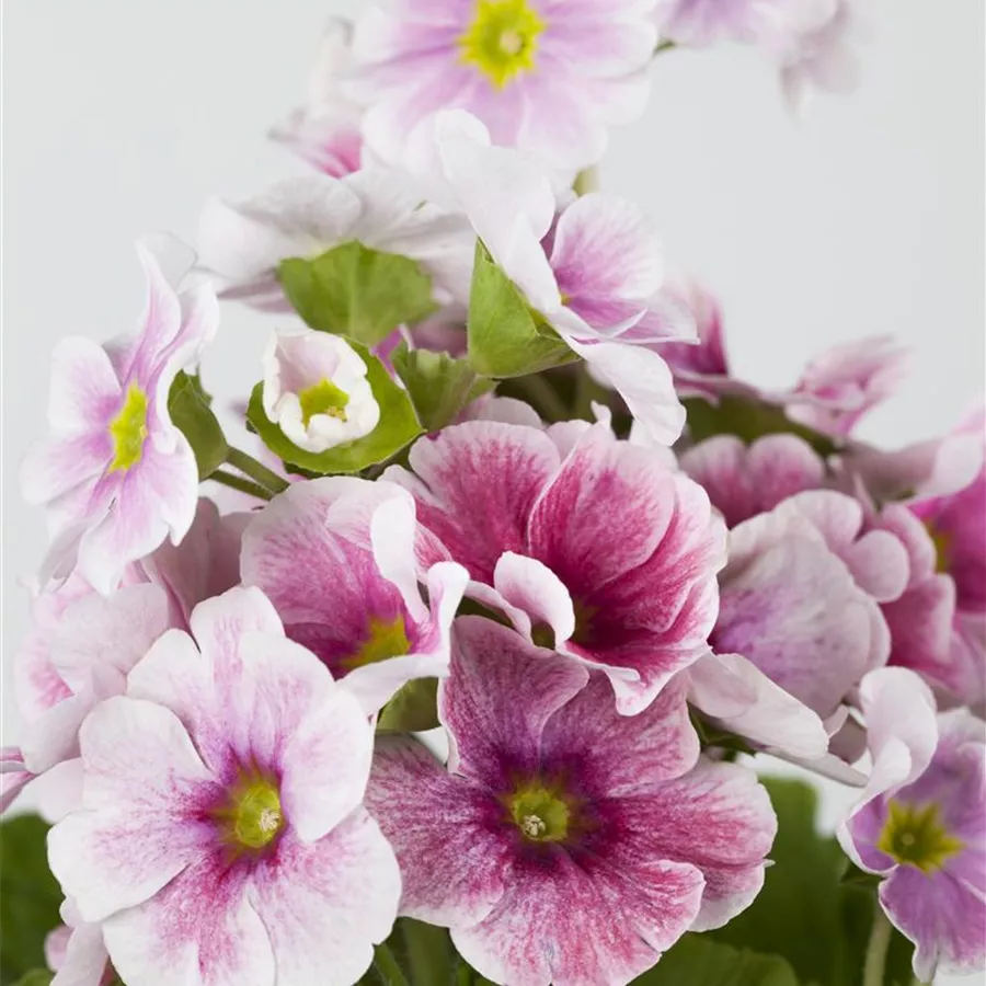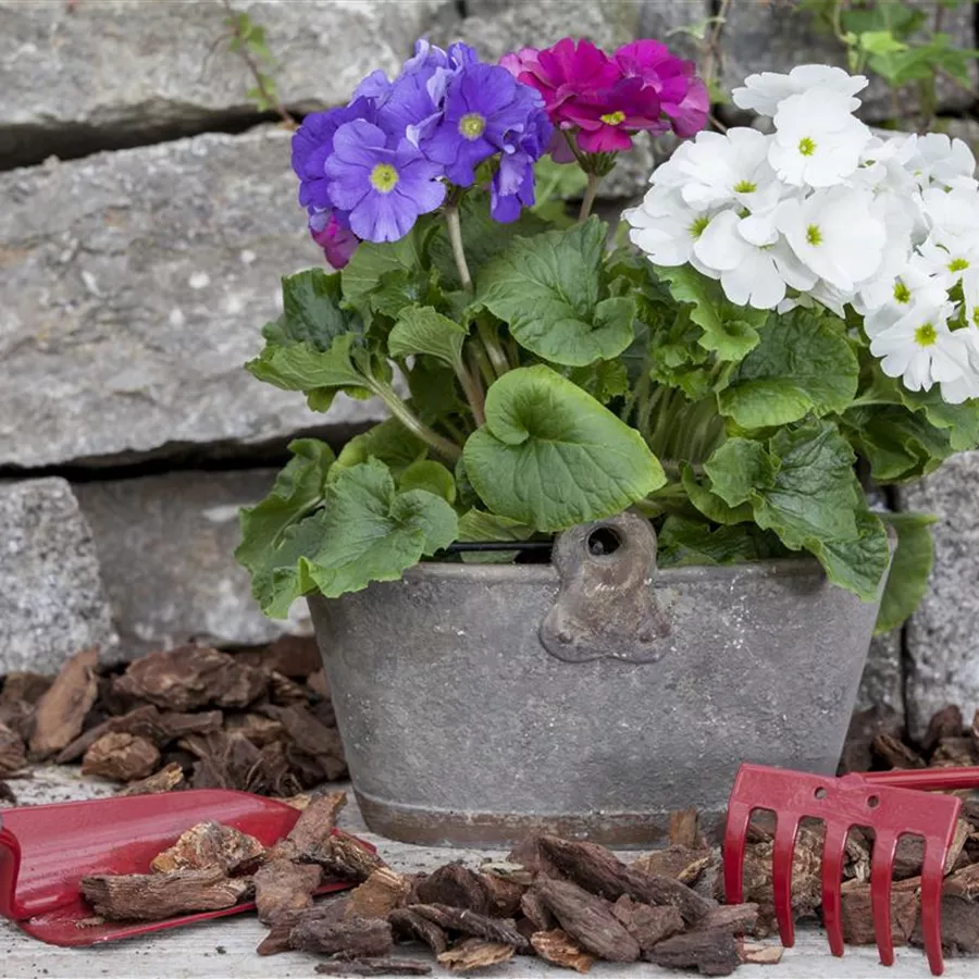 Primula obconica bildet schalenförmige, rote, violette, weiße Blüten ab März.