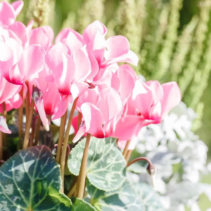 Die wintergrünen Blätter des Alpenveilchens sind mehrfarbig, herzförmig, gezähnt.