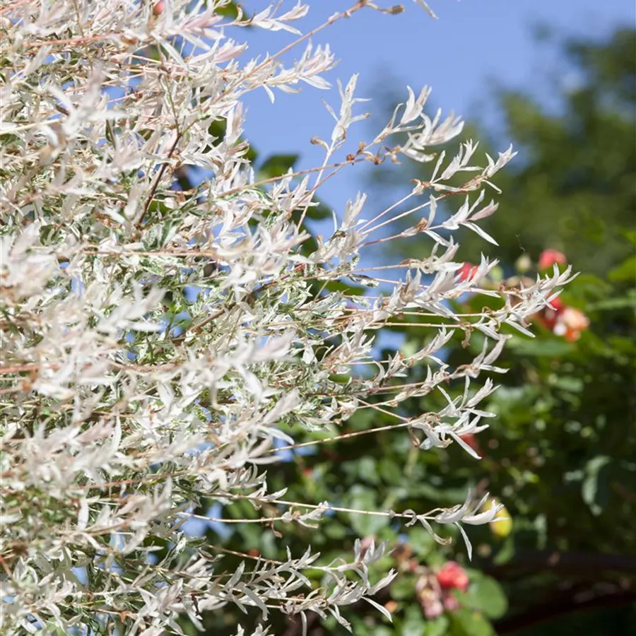 Harlekin-Weide 'Hakuro Nishiki' ist auch unter diesem Namen bekannt: Weißblättrige Weide, Zierweide oder Japanische Weide.