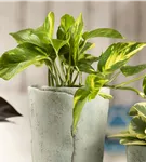 Die immergrünen Blätter der Goldene Efeutute sind mehrfarbig, herzförmig. Diese sind etwa 10 - 20 cm groß.