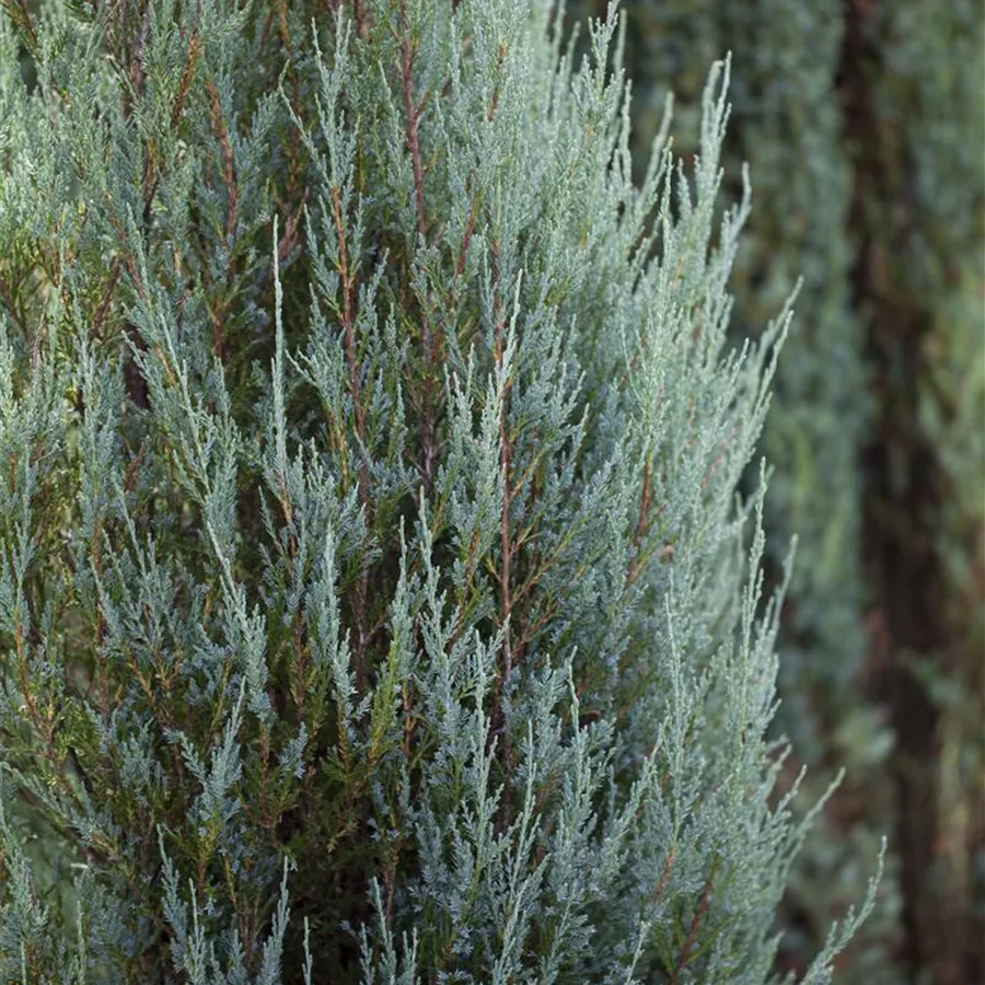 Der Virginische Wacholder 'Blue Arrow' ist immergrün. Seine Nadeln sind blau-grau, schuppenförmig.