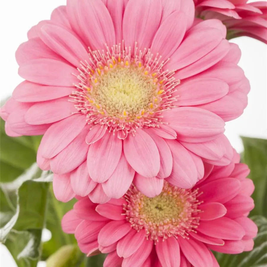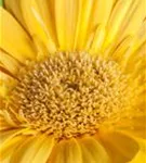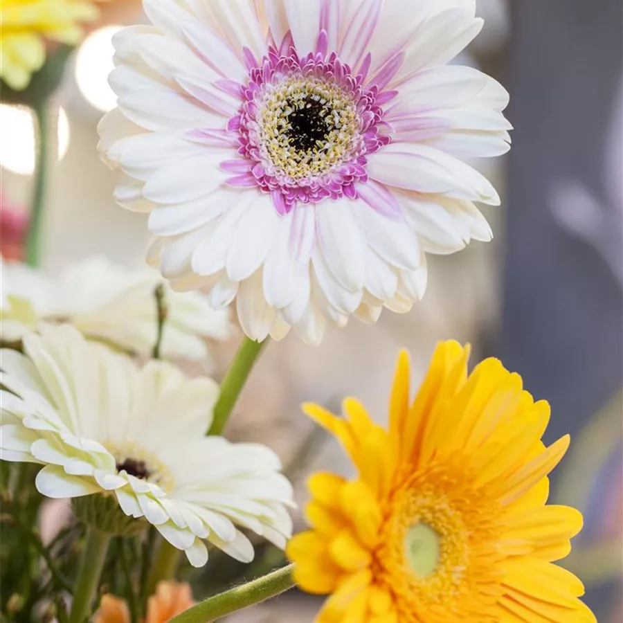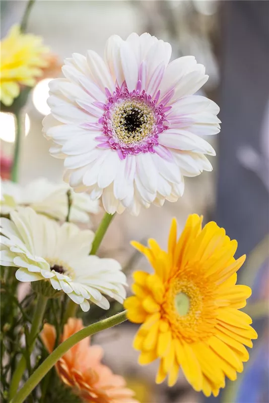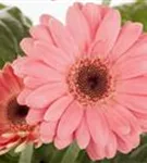 Gerbera bildet körbchenartige, weiße, gelbe, orangefarbene, rote, rosafarbene Blüten ab Juni.