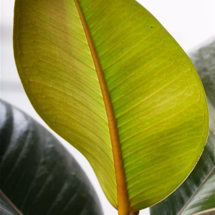 Die immergrünen Blätter des Gummibaums sind dunkelgrün, glänzend.