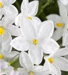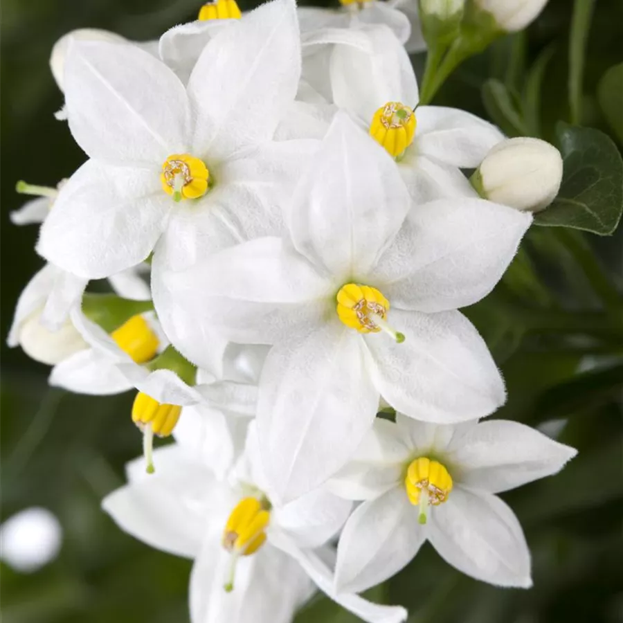 Solanum jasminoides bildet während der gesamten Saison zahlreiche sternförmige, weiße Blüten.