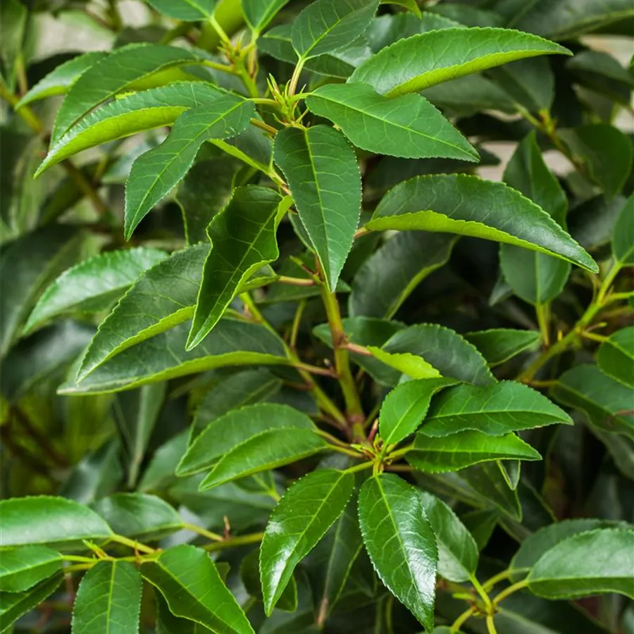 Die immergrünen Blätter der Portugiesische Lorbeerkirsche sind dunkelgrün, lanzettlich, glänzend, wechselständig. Diese sind etwa 6 - 12 cm groß.