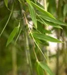 Die immergrünen Blätter des Muriels Schirmbambus sind dunkelgrün, lanzettlich.
