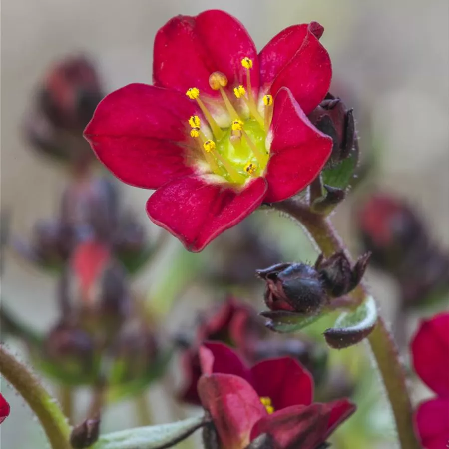 Saxifraga x arendsii, rot bildet schalenförmige, rote Blüten ab April.