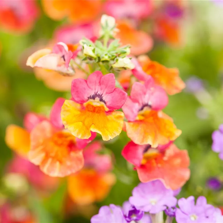 Nemesia bildet während der gesamten Saison zahlreiche lippenförmige, in Trauben angeordnete, weiße, rosafarbene, rote, gelbe, blaue, lilafarbene Blüten.