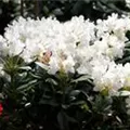 Rhododendron 'Cunningham´s White' bildet von Anfang Mai bis Anfang Juni zahlreiche trichterförmige, in Dolden angeordnete, weiße Blüten mit zartgelber Zeichnung.