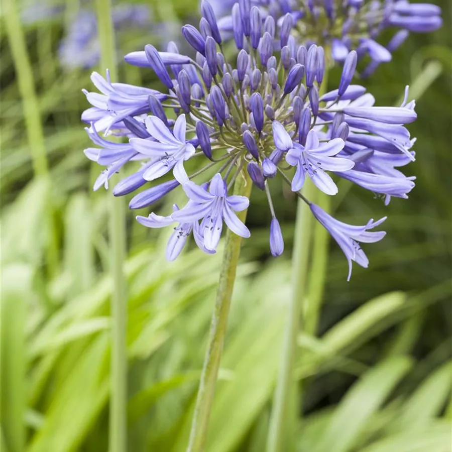 Agapanthus africanus bildet sternförmige, in Ähren angeordnete, blaue, weiße Blüten ab Juni.