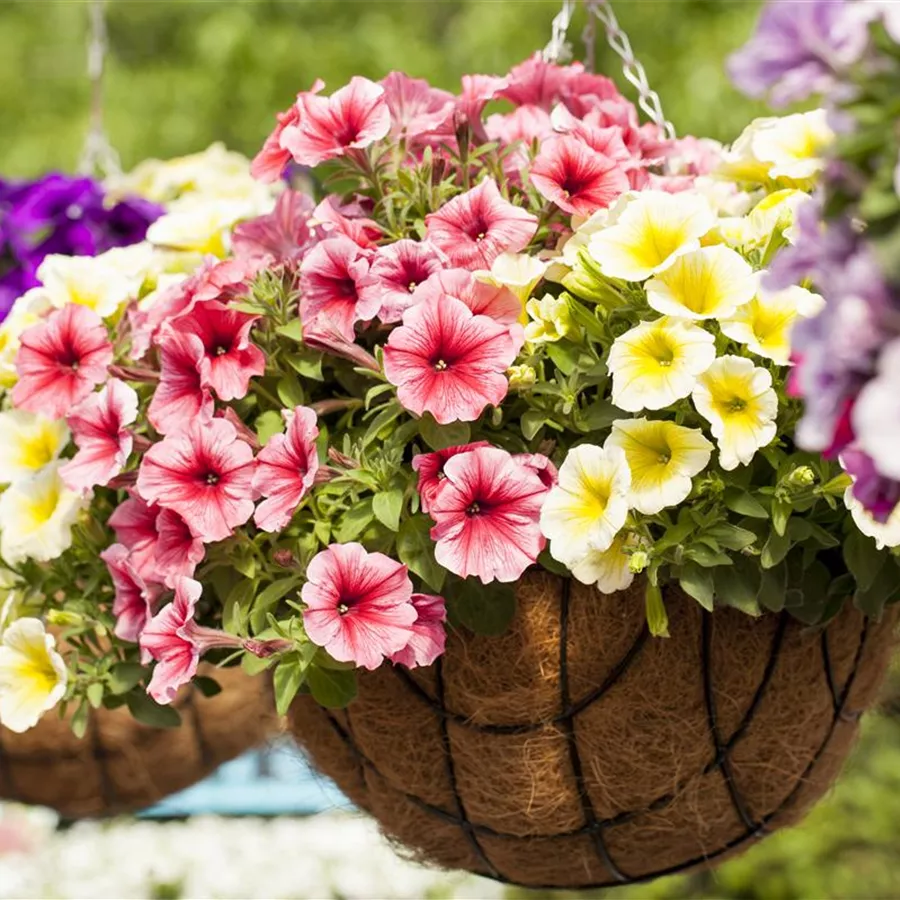 Petunia 'Potunia'® bildet während der gesamten Saison zahlreiche trichterförmige, bunte, weiße, rosafarbene, rote, violette Blüten.