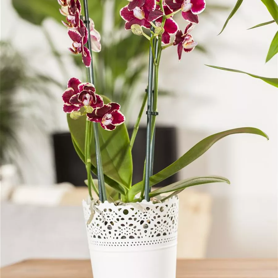 Phalaenopsis, rot bringt von Januar bis Dezember dekorative rote Blüten hervor.