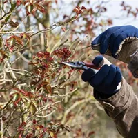 Jedes Gärtnerherz wird weich, wenn man an der geliebten Pflanze herumschnibbeln muss. Aber: die Rose wird sich mit einem üppigen Wuchs und hübschen Blüten bedanken. Generell gilt beim Rosenschnitt: scharfes Werkzeug benutzen. Eine scharfe Schere ist für den Rückschnitt besonders wichtig, damit glatte Schnittflächen entstehen. Das verletzt die Pflanze so wenig wie möglich und hilft ihr mehr, als dass es ihr schadet. Außerdem sollte das Schneidwerkzeug unbedingt sauber sein. Das ist unerlässlich, damit sich keine Krankheiten ausbreiten können. Geschnitten wird immer schräg. Das hat den einfachen Grund, dass sich in und an der Schnittfläche kein Wasser sammeln kann, das zu Krankheiten führen kann. Geschnitten wird etwa 5 Millimeter oberhalb einer nach außen zeigenden Knospe. Wenn eine Rose nur noch wenige kräftige Triebe hat, kommt sie mit einem radikalen Rückschnitt buschig wieder auf die Füße.