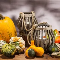 Kürbisse gehören sowieso zum Repertoire, wenn man an Herbst-Deko denkt. In Farben und Formen sind sie so vielfältig, dass für jeden etwas dabei ist. Außerdem kann man die Arten so wunderbar miteinander kombinieren. Von groß bis klein und von leuchtend orange bis dezent grün kann alles neben- und sogar mal übereinander stehen. Auf der Eingangstreppe fantasievoll aufgestellt, sorgen sie für gute Laune, sobald man nach Hause kommt. Auch Gäste mögen es, wenn sie jahreszeitengemäß und kreativ zugleich begrüßt werden. Wer es besonders heimelig mag, stellt noch eine rustikale alte Laterne dazu. Vielleicht noch ein paar Kastanien, frisch aus der stacheligen Umhüllung gesprungen, zur Lichtquelle drapieren?